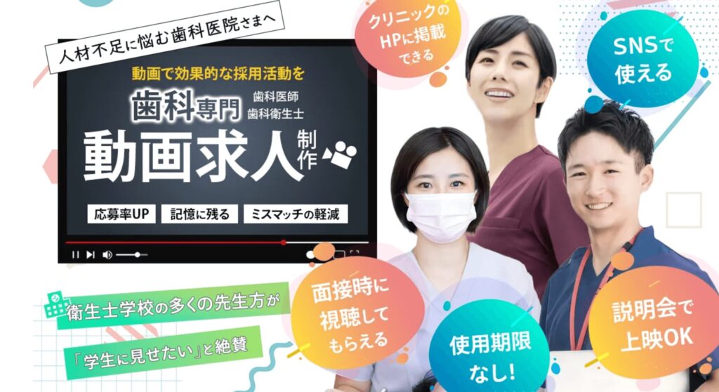 DEN-PROが多くの歯科医院から高い評価を得ている理由のひとつとして、動画を活用したアプローチを得意としていることが挙げられます。DEN-PROでは、求職者に医院の魅力を効果的に伝える採用動画の制作サービスを提供しており、YouTubeでの二次活用も可能です。